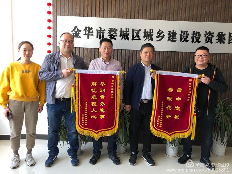 4月9日下午,區(qū)城投集團(tuán)名下金茶花產(chǎn)業(yè)園的承租企業(yè)金華市九弍叁物流有限公司代表鄭俊和金華市捷安電動工具有限公司代表朱青鋒來到區(qū)城投集團(tuán),將兩幅分別繡有“雪中送炭 春暖花開”、“盡職責(zé)辦實事 解憂難暖人心”的錦旗親自送到區(qū)城投集團(tuán)董事長、總經(jīng)理張紹華和副總經(jīng)理鄭祖剛的手中,代表企業(yè)對集團(tuán)在疫情期間主動為他們減免租金表示由衷的感謝。