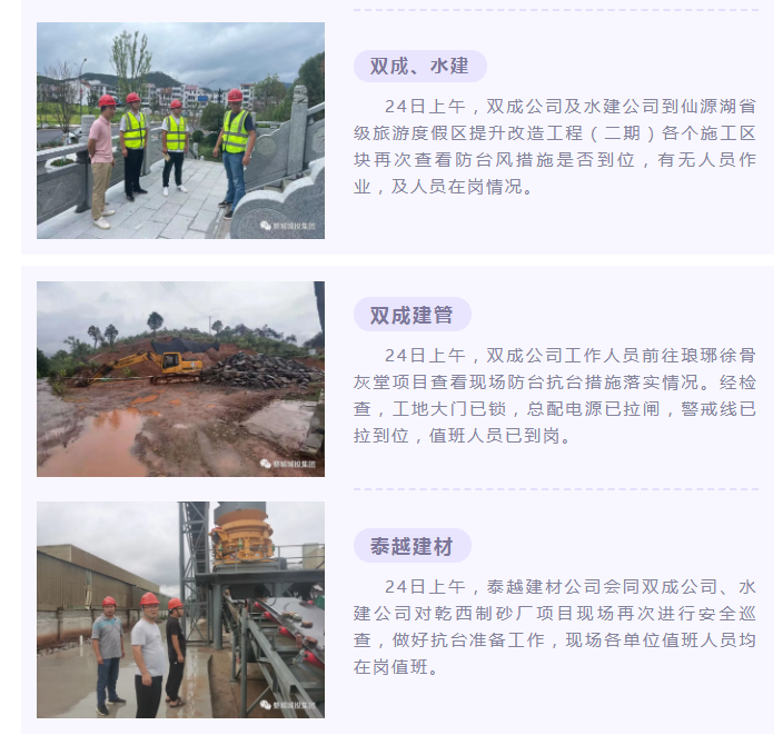 雙成公司召開(kāi)鐵路文化公園防臺(tái)專題會(huì)議,要求施工單位加強(qiáng)現(xiàn)場(chǎng)圍擋、臨時(shí)板房的加固工作等防臺(tái)工作,準(zhǔn)備防臺(tái)物資,設(shè)立臨時(shí)民工安置點(diǎn),成立防臺(tái)應(yīng)急小分隊(duì),要求保障公園防臺(tái)的同時(shí),隨時(shí)響應(yīng)集團(tuán)的號(hào)召。